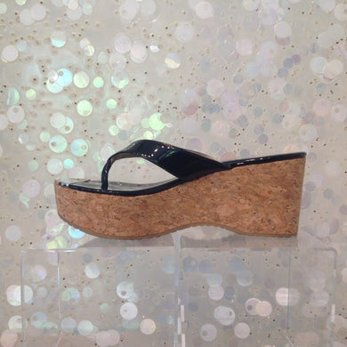 JIMMY CHOO Panna Black Patent Leather Cork Wedge Slide Sandals