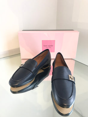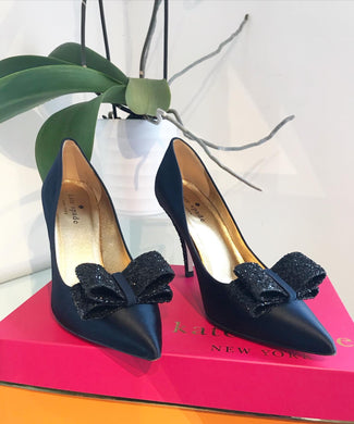 KATE SPADE Latrice Navy Satin Black Glitter Bow Pointy High Heel Pumps