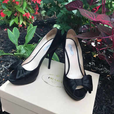 PRADA Satin Bow Peep Toe High Heels