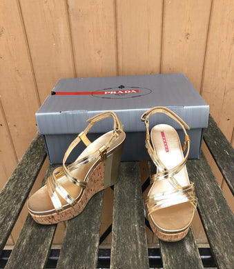 PRADA Patent Leather Cork Platform Wedge Sandals