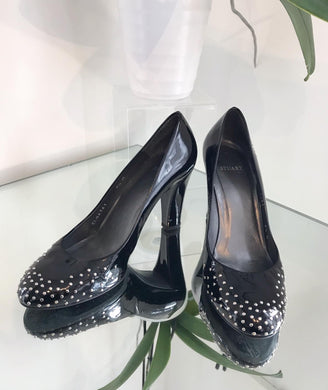 STUART WEITZMAN Black Patent Leather Studded Pumps