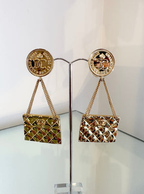 CHANEL Vintage Gold Metal CC Coin Quilted Flap Bag Clip-On Drop Earrings