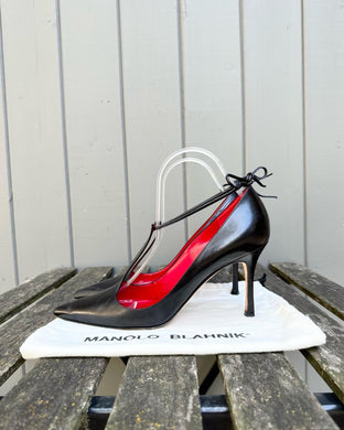 MANOLO BLAHNIK Pointed Toe T-Strap High Heel Leather Pumps