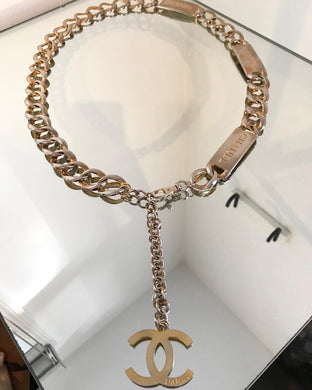 CHANEL Vintage Gold Tone Logo Engraved Bar CC Chain Belt Necklace