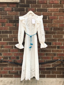 ZIMMERMANN White Carnaby Scallop Long Sleeve Linen Dress With Teal Blue Rope Tie